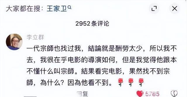 李立群这回在向太评论区“开撕”王家卫,也是因为《一代宗师》,不得不说,还是他比较有先见之明。 因为酬劳太少,所以李立群在当年回绝了《一代宗师》的邀请,事到如今,他自己也觉得这是个正确决定。